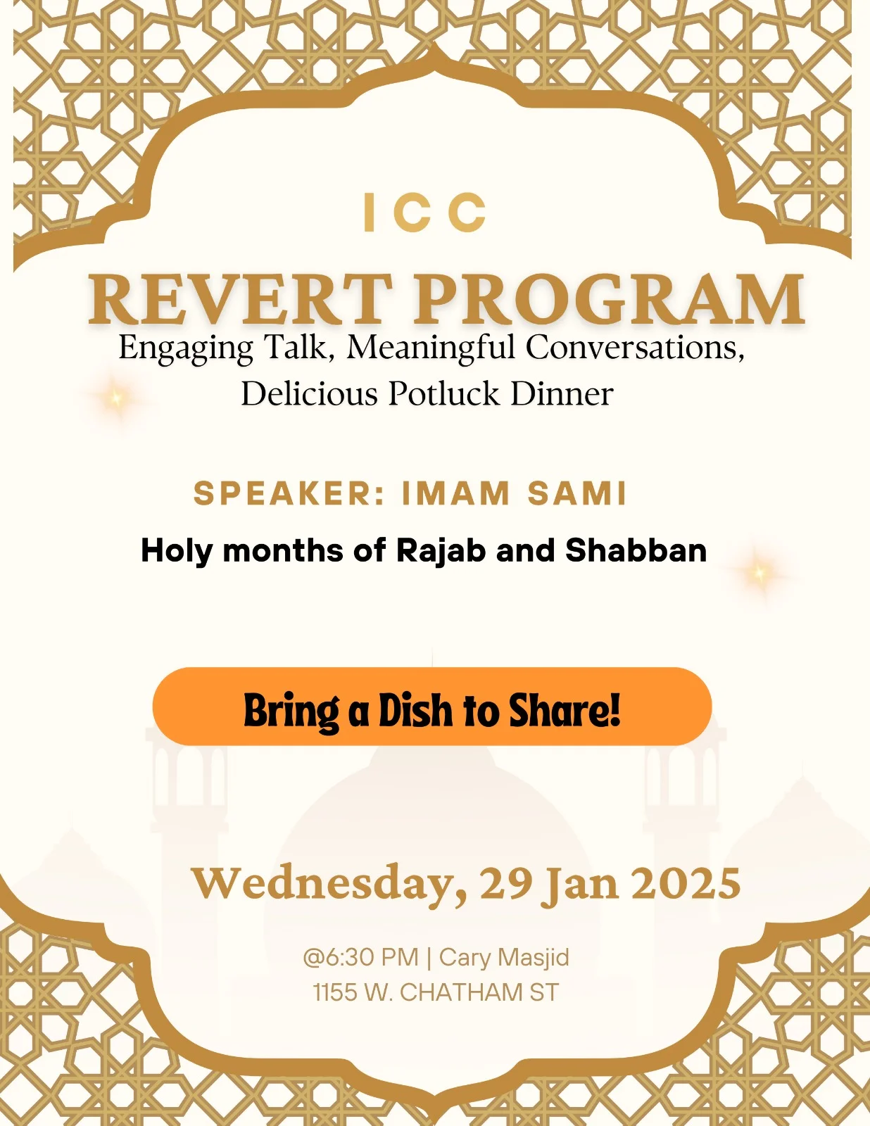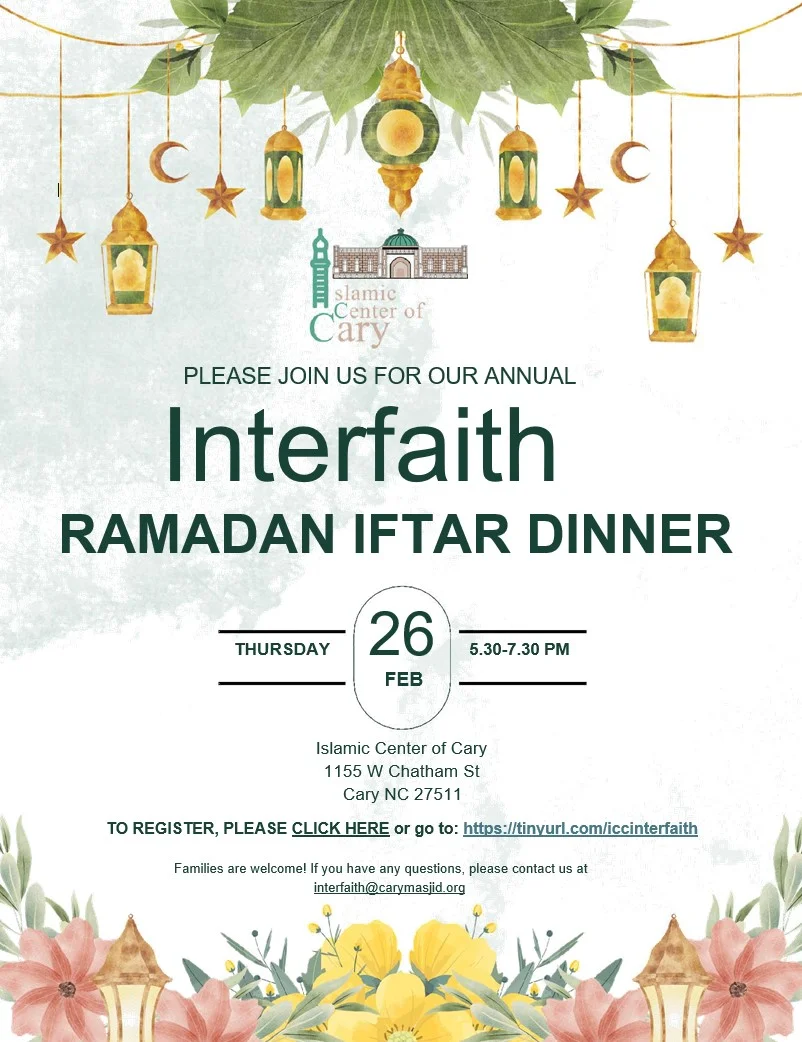 PLEASE JOIN US FOR OUR ANNUAL Interfaith RAMADAN IFTAR DINNER on Thursday February, 26th 5:30 PM to 7:30 PM Islamic Center of Cary1155 W Chatham